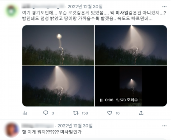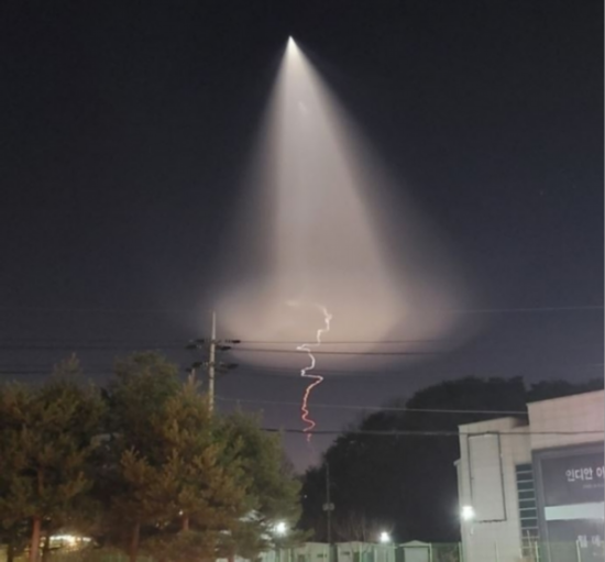 【环球网报道 记者 付嘉骏】综合《韩国日报》、MBN电视台1月2日报道,近日韩国多地有市民表示在天空中目击到不明飞行物(UFO)和奇异光芒,引发混乱和恐慌。对此,韩国国防部于本月2日回应称,30日晚曾进行韩国自研固体燃料运载火箭的第二次试飞,当时市民所看到的飞行物正为此物。对于事前未告知试飞计划,希望民众予以理解。