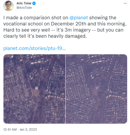 据《卫报》报道,这一对比卫星图像由总部位于荷兰的调查新闻机构“Bellingcat”培训兼研究主管托勒制作。他于当地时间2日晚些时候在推特发文称,“我在Planet Labs上做了一个对比图像,展示了(去年)12月20日和今天上午(1月2日)的那所职业学校(的状态)。很难看清楚…… 但你可以清晰地看出它遭到了严重破坏。”配文末尾附上了卫星对比图的网页链接。