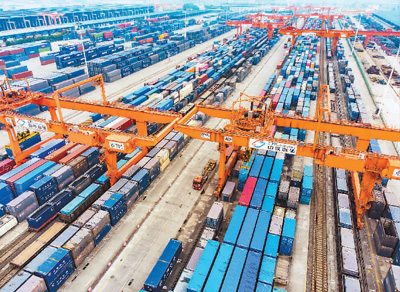 2021年以来,重庆市在服务业扩大开放综合试点中通过探索建立中欧班列定价协商相关机制、在重庆口岸建设西部陆海新通道集装箱共享调拨体系等,打造内陆国际物流枢纽。图为2022年12月26日,在重庆市沙坪坝区重庆国际物流枢纽园区内,团结村铁路中心站呈现一派繁忙景象。