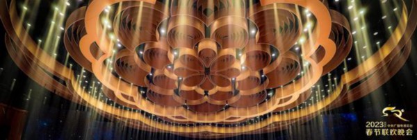2023年春晚舞美设计体现“满庭芳”的理念,取意自中国古典文学词牌名,通过演播大厅多个方位的设计,共同营造祈愿圆“满”的中华大家“庭”尽展“芳”华的主题气象。其中,由四瓣花结构演化重构而成的演播厅顶部艺术装置,既是根植于中华文明的美学创造,又是绽放着现代设计理念的创新呈现。创意取材自距今6000年至4800年前的庙底沟彩陶标志性的“花瓣纹”,著名考古学家苏秉琦先生曾提出:花卉图案彩陶,可能就是华族(即华夏民族)得名的由来。