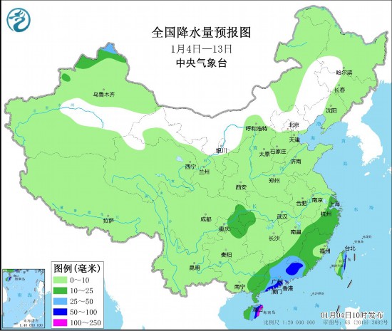 未来10天(2023年1月4-13日),新疆北部、东北地区南部、汉水流域、江南中东部、华南中东部、四川盆地及贵州北部等地累计降水量有5~20毫米,部分地区40~70毫米,局地超过100毫米;新疆北部、东北地区南部、华北西部、西北地区东南部、四川盆地北部及海南岛等地降水量较常年同期偏多4~8成,局地偏多1倍以上;云南中南部降水偏少3~6成;其余大部地区降水接近常年。