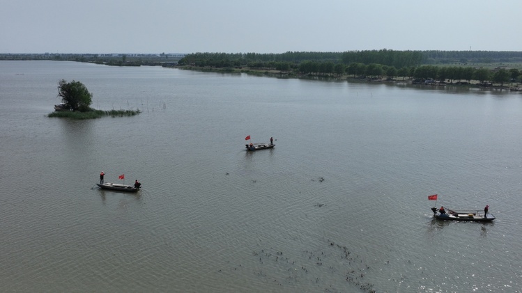 岔河镇管护员们在湖中打捞漂浮物。殷潮 摄