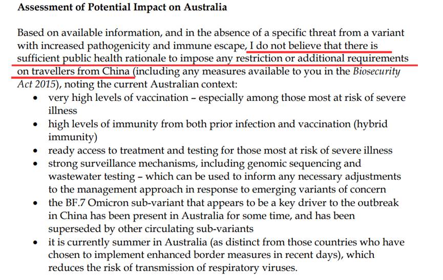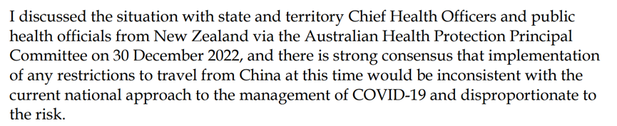 同时,他还列举了其他澳大利亚无需对中国旅客进行限制的理由:①澳大利亚目前拥有很高水平的疫苗接种率——尤其是高危人群的接种率;②由于疫苗接种或此前感染而获得的高水平的免疫力;③为应对潜在危重症患者而做好的准备;④强有力的病毒监控机制;⑤澳大利亚现在是夏天,这会减少呼吸道疾病传播的风险。