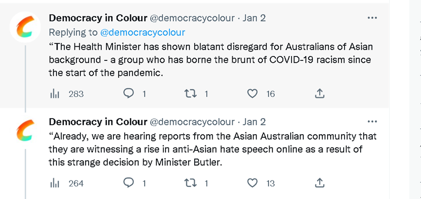 该组织还认为,澳大利亚卫生部这种“奇怪”的做法,会助长澳大利亚国内的反亚裔种族主义情绪。