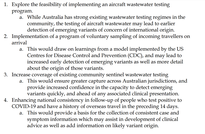 那么,澳大利亚该如何做才妥当呢?就像此前美国一些流行病学专家建议的那样,凯利在信中认为官方应该做的是进一步增强对入境旅客的病毒检测,比如对国际航班的废水进行检测,对入境旅客实行自愿病毒检测,增强对国内社区的废水检测,以及增强对于澳国内那些在14天内有国际旅行史的阳性病例的追踪。