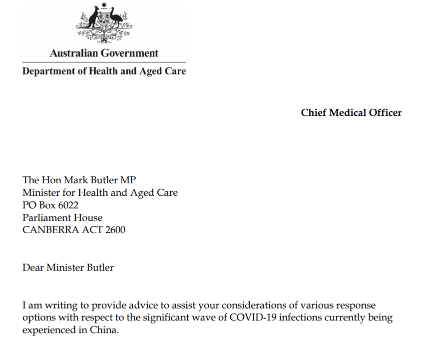 从这封发布在澳大利亚卫生部官网上的信件来看,凯利是在给澳大利亚卫生部长马克·巴特勒(Mark Butler)提供应对中国调整防疫政策后出现的感染潮的建议时,做出这一表态的。