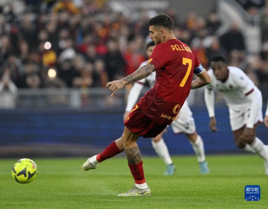 1月4日,罗马队球员佩莱格里尼主罚点球命中。新华社发(奥古斯托·卡萨索利摄)