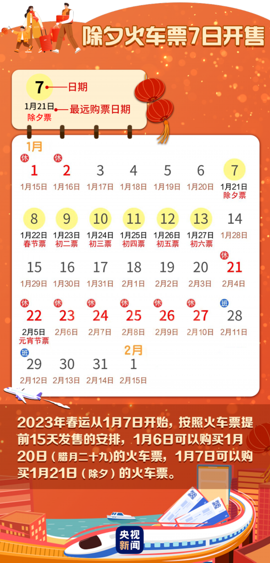 兔年春节临近,2023年春运从明日(1月7日)开始至2月15日结束,为期40天。除夕火车票何时可购买?出行天气如何?返乡有哪些注意事项?这份出行指南请查收。