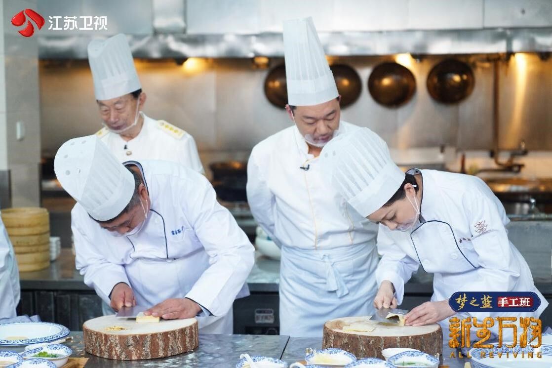 而在后厨红案区,淮扬菜烹饪大师居长龙和富春茶社总经理王洪波向一行人介绍了淮扬名菜烫干丝的玄妙之处。淮扬菜的一大特色,在于将并不名贵的食材做出精致的感觉,这就要求厨师必须有极其精湛的刀工。烫干丝的绵软口感,正是依仗于此。面对这样的考验,杨澜竟也用自己略显生涩的刀工完成了这项高难度工作,收到了居长龙的“点赞”。