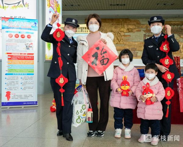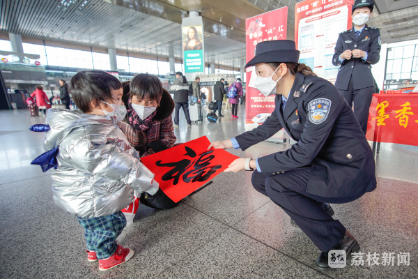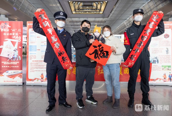 “现在的民警真的是太贴心了,我们一家出行比较担心的一些乘车问题,民警都给我们耐心讲解,让我们出行更加安心了。”从南京返乡的张先生说,“民警还给我们准备了‘福’字和对联,让我在旅途中也感受到了温暖的年味。”张先生为现场宣传民警竖起了大拇指。