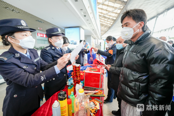 上午9时30分许,讲授反诈知识、发放“年味”礼品、介绍铁路新规……候车室内,南京南站派出所和南京铁路公安处特警支队民警以多种形式与旅客开展互动。