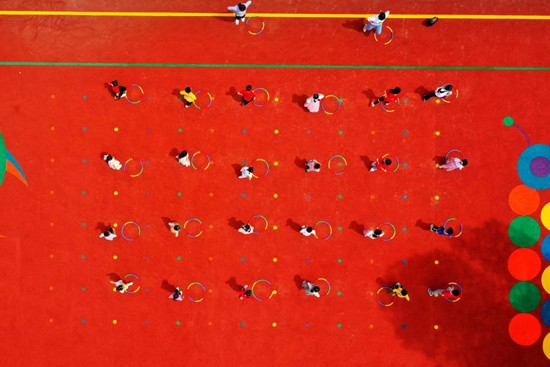 2022年6月9日,湖北省襄阳市保康县歇马镇百峰幼儿园孩子们在新操场上练习呼啦圈操。据介绍,百峰幼儿园是2013年9月由百峰小学校舍改建的农村幼儿园,办园条件比较落后。2021年10月投资280万元在原址重建了标准化的农村幼儿园。视觉中国供图(资料图片)