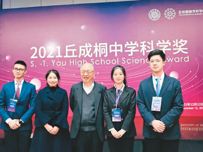 丘成桐(左三)与参加“2021丘成桐中学科学奖”全球总决赛的部分选手和带队教师合影留念。