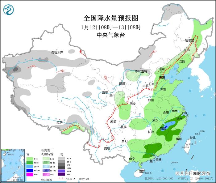 1月10日08时至11日08时,内蒙古东北部、新疆北部和西部山区等地部分地区有小到中雪,其中,新疆北疆北部等地部分地区有大到暴雪(10~19毫米)。江南东南部、华南大部、台湾岛等地部分地区有小到中雨,其中,广西东南部沿海、广东西南部等地部分地区有大雨(见图1)。渤海、东海西南部、台湾海峡、巴士海峡、南海北部和中部海域将有5~7级、阵风8级的大风。