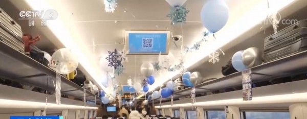 1月7日,贵州首趟“冰雪运动”主题列车从贵阳北站开出,前往六盘水。车厢以冰雪元素为主题进行装扮打造,还有滑雪装备供旅客体验。