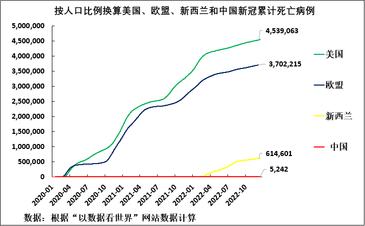 图1:按人口比例换算美国、欧盟、新西兰和中国新冠累计死亡病例