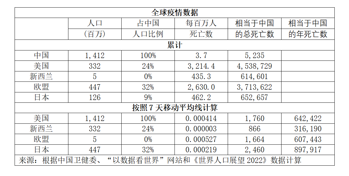 首先谈最重要的问题——拯救人类生命。按照人口比例计算,如果三年来中国人均新冠死亡率与美国相同,那么中国相当于拯救了450多万中国人的生命。与欧盟相比,中国则相当于拯救了370万中国人的生命。