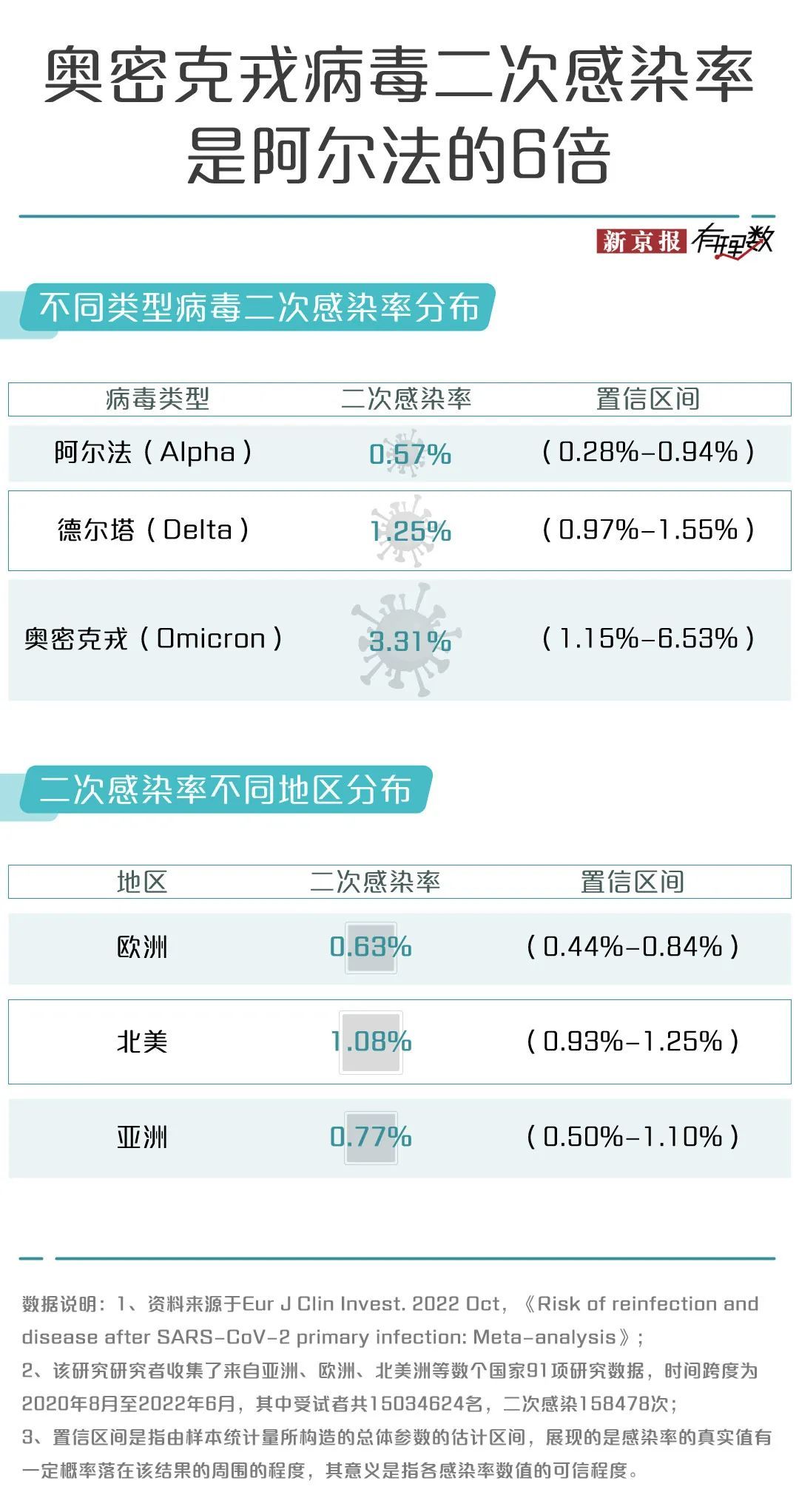 2022年8月,一份发表在《欧洲临床研究杂志》的研究表明,奥密克戎病毒的二次感染率要远高于阿尔法和德尔塔。这份研究收集亚洲、欧洲及北美等地区150多万受试者的感染数据,其中二次感染的有15.8万人,阿尔法病毒二次感染率为0.57%,德尔塔为1.25%,而目前最为流行的奥密克戎二次感染率达到3.31%。