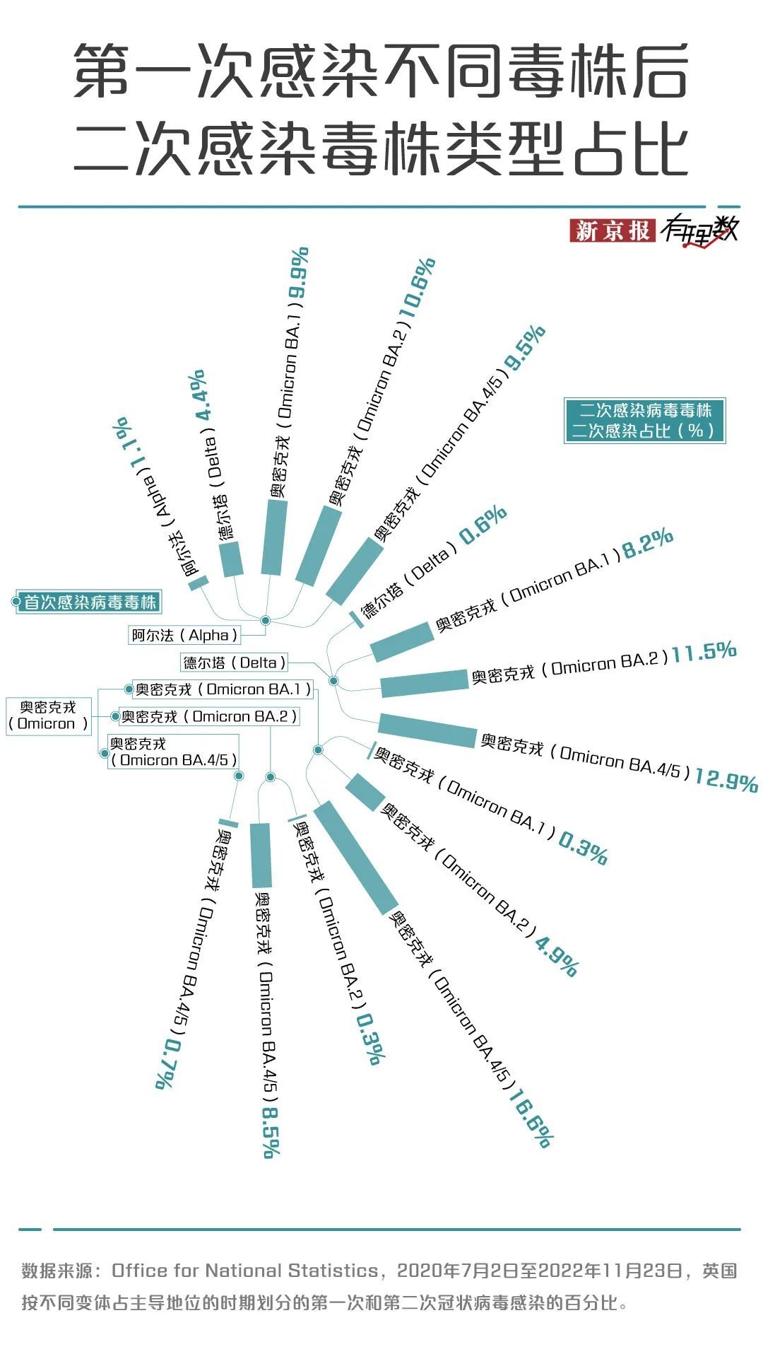 据英国统计局2022年12月23日公布的数据,如果感染者首次感染的毒株是奥密克戎ba.4/ba.5,二次感染这一毒株的人群占比仅为0.7%。但如果第一次感染的是奥密克戎BA.1,或者是阿尔法和德尔塔,那二次感染奥密克戎ba.4/ba.5的人群最高可达16.6%。