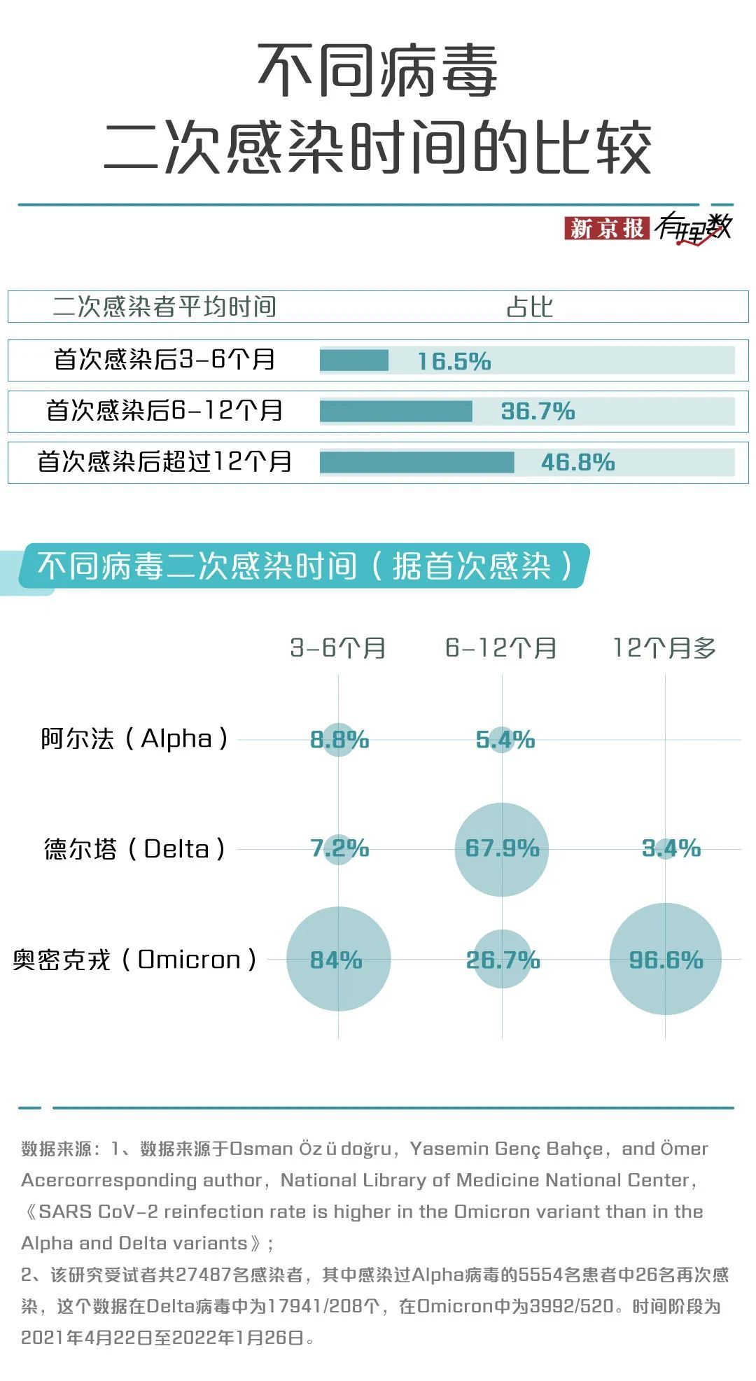 在二次感染人群中,不同的病毒也有明显差异,二次感染期为3-6个月的感染者中,8.8%的人感染的是阿尔法变体,7.2%是德尔塔变体,其他84%都是奥密克戎变体。