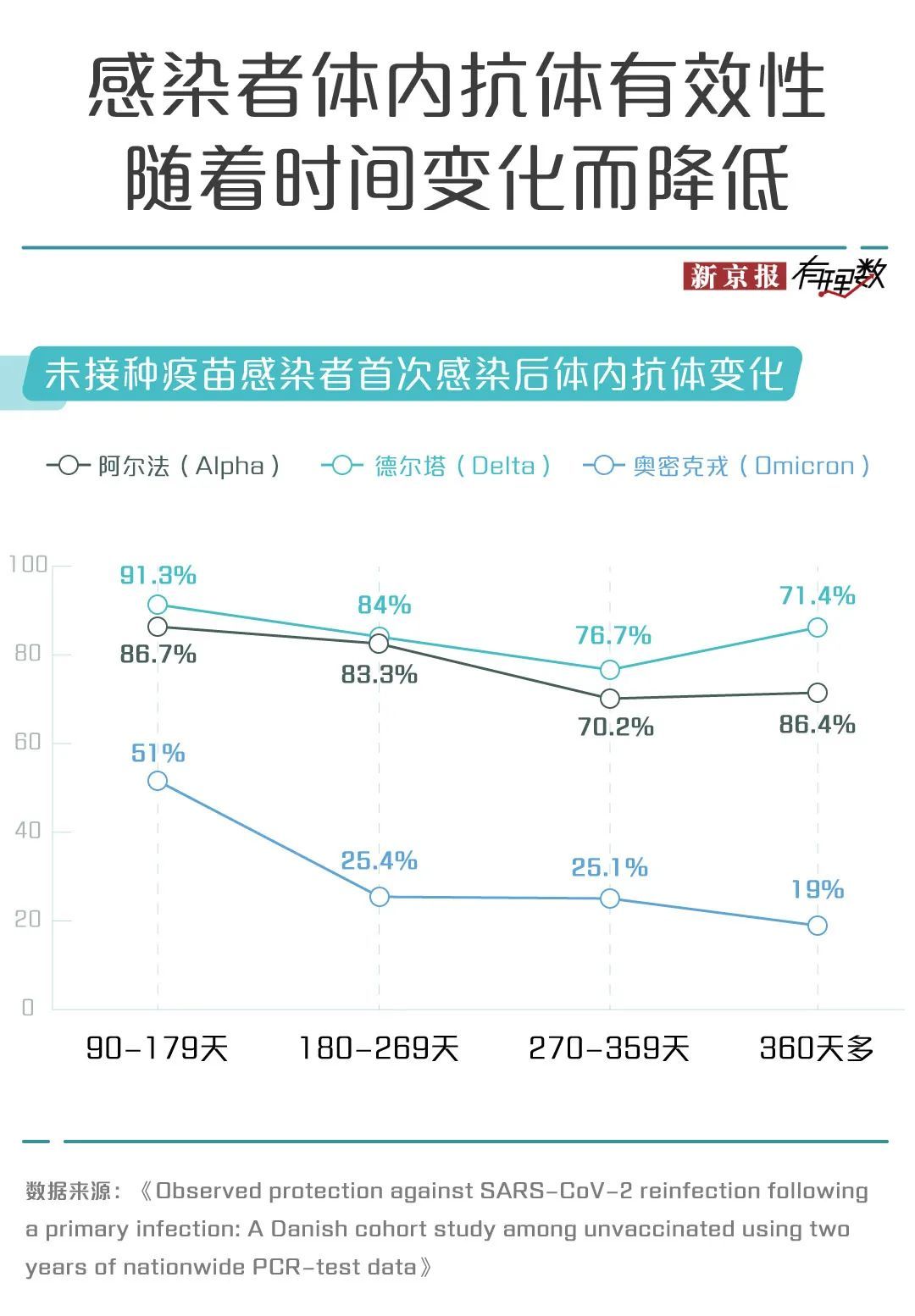 二次感染时间与感染者体内抗体有密不可分的关系。今年6月,丹麦一份研究表明,在未接种疫苗感染新冠病毒后,与阿尔法、德尔塔相比,感染奥密克戎后抗体保护性下降的更多。