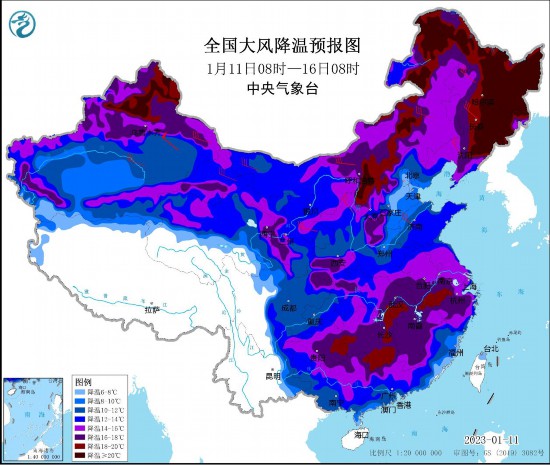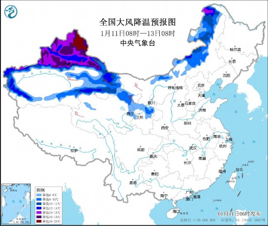 受强冷空气影响,预计,1月11日至15日,寒潮天气将自西向东影响我国大部地区,其中,11日至12日主要影响西北地区,12日夜间至15日影响我国中东部地区。我国大部地区气温将先后下降8~12℃,其中,新疆北部、甘肃中西部、内蒙古中东部、东北地区、江汉东部、江淮、江南、华南北部、贵州等地降温14~18℃,新疆北部、吉林中东部、黑龙江等地的部分地区超过20℃,并伴有4~6级,阵风6~8级大风,新疆山口风力可达8~10级。降温过后,17日早晨,最低气温0℃线将南压至云南东部至贵州南部、湖南南部、福建北部、浙江东部一线。