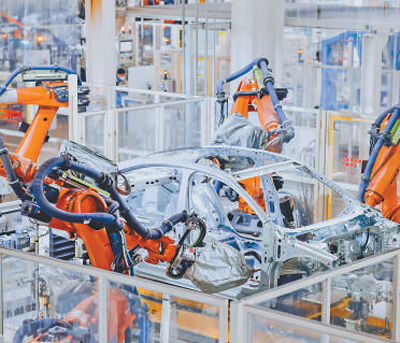 在一汽—大众华东基地焊装车间,机器人进行焊接作业。梁孝鹏摄(影像中国)
