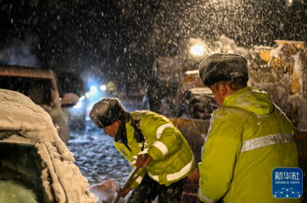 ↑叶尔加那提·托合达尔前去检查车辆和人员受困情况(1月8日摄)。