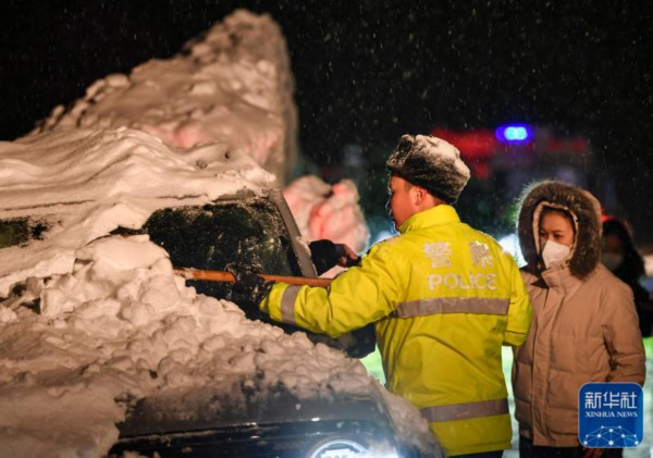 ↑参与救援的民警帮助游客清除车辆上的积雪(1月8日摄)。