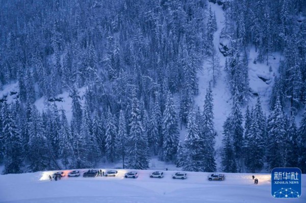 ↑这是在距新疆阿勒泰地区禾木村约45公里处拍摄的一处风雪救援现场(1月8日摄,无人机照片)。