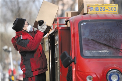 2022年12月20日下午,北京市经开区大琛科技园顺丰公司兴业街速运营业点内,快递员们忙个不停。快递车装满包裹后快速出发,驶向不同送货地点。