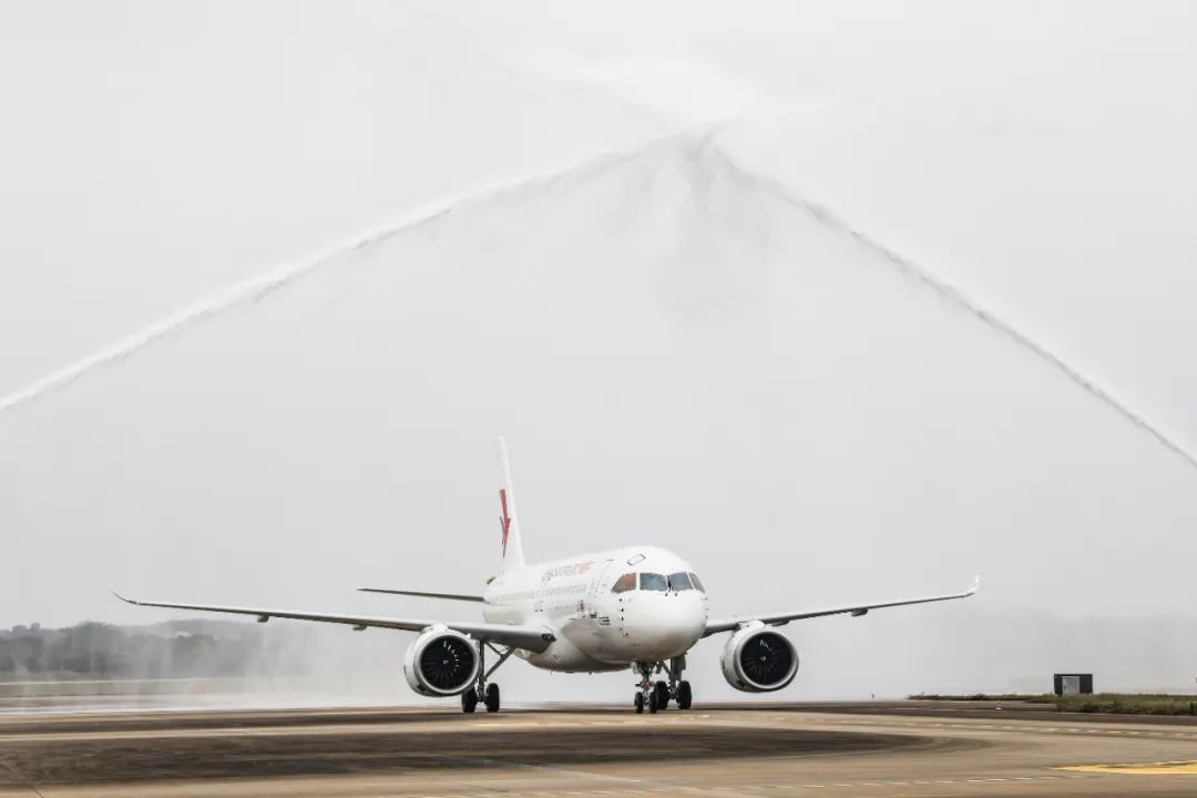 资料图:1月2日,海口美兰国际机场为国产大飞机C919举行“过水门”仪式。新华社记者 张丽芸 摄