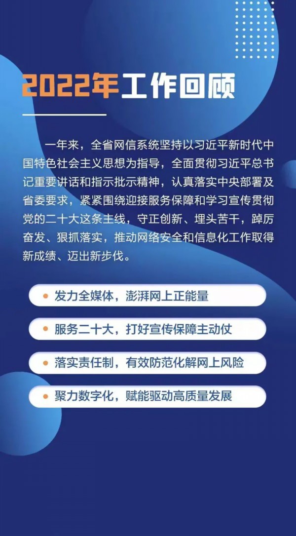 会议指出,2022年是党和国家历史上具有里程碑意义的一年,也是网信工作面临复杂严峻考验的一年。全省网信系统认真落实中央部署及省委要求,紧紧围绕迎接服务保障和学习宣传贯彻党的二十大这条主线,发力全媒体,澎湃网上正能量;服务二十大,打好宣传保障主动仗;落实责任制,有效防范化解网上风险;聚力数字化,赋能驱动高质量发展,推动网络安全和信息化工作取得新成绩、迈出新步伐。