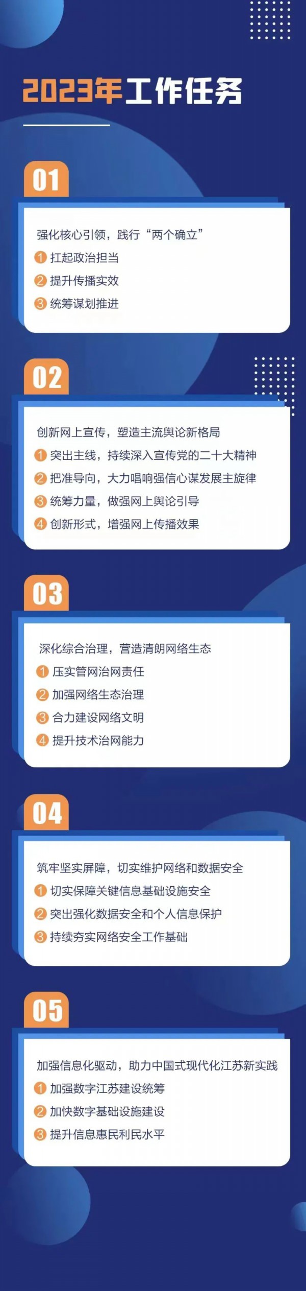 会议强调,2023年是全面贯彻落实党的二十大精神的开局之年,是全面建设社会主义现代化国家、向第二个百年奋斗目标进军的关键一年。全省网信系统必须坚持以习近平新时代中国特色社会主义思想特别是习近平总书记关于网络强国的重要思想为指导,全面学习、全面把握、全面落实党的二十大精神,深入贯彻落实党中央决策部署及省委工作要求,更好统筹发展和安全,以建设全媒体传播体系、塑造主流舆论新格局加强网络内容建设管理,以健全网络综合治理体系营造清朗网络空间,以筑牢网络安全屏障维护国家安全,以信息化数字化驱动经济社会高质量发展,着力提升网络安全和信息化工作水平,着力推进网络强省建设,在新征程上为全面推进中国式现代化江苏新实践,更好“扛起新使命、谱写新篇章”提供有力服务、支撑和保障。