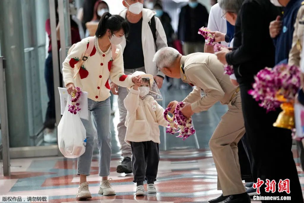 泰国副总理兼卫生部长、交通部长、旅游与体育部长一道亲自到机场接机,迎接中国出入境旅游逐步恢复后第一批抵达泰国的游客。收到花环和礼物的中国游客笑意盈盈,表示“感觉很好,感受到了泰国人民的好客之情!”
