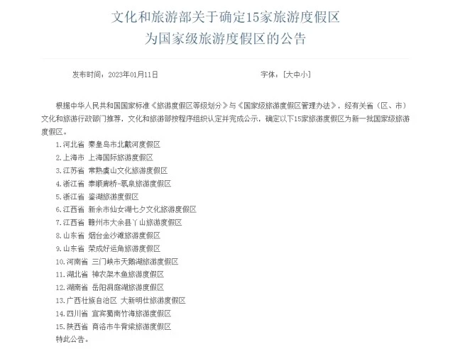 北戴河等15家旅游度假区被评为国家级旅游度假区