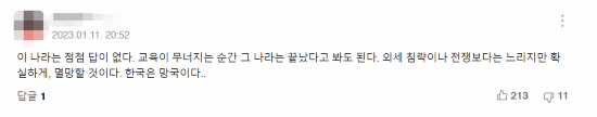 另一名网友悲观地表示:“这个国家越来越无解了。教育崩溃的瞬间,就是国家灭亡的时刻。这样消亡虽然比外族侵略或发生战争来得慢些,但可以确定的是,韩国是要亡国了。”↓