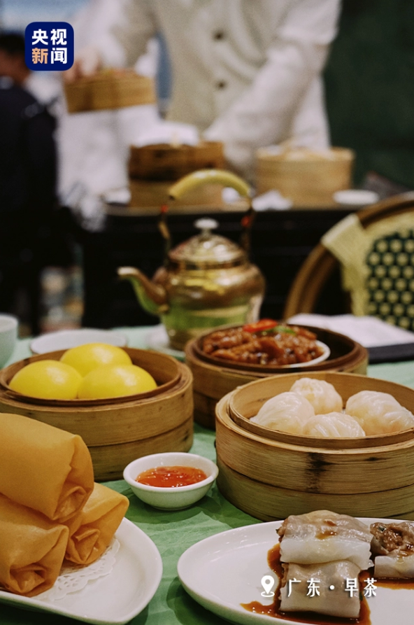 “走,饮茶先啦!”男女老少围坐一桌,吃着早茶,谈笑风生,好不热闹。