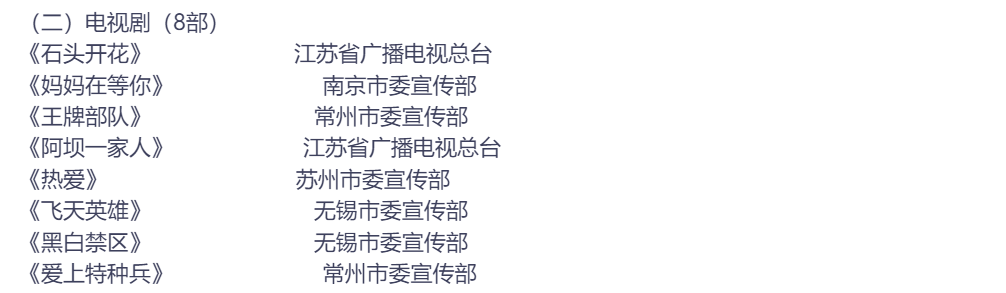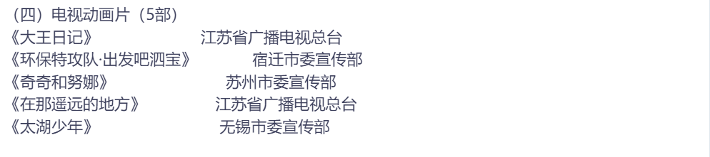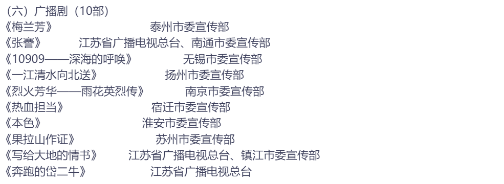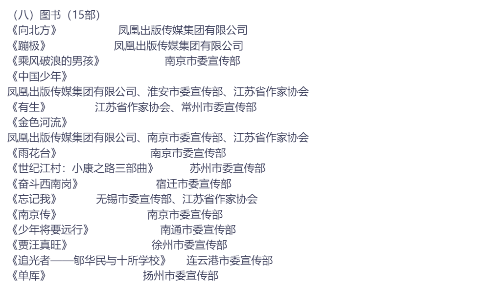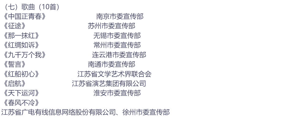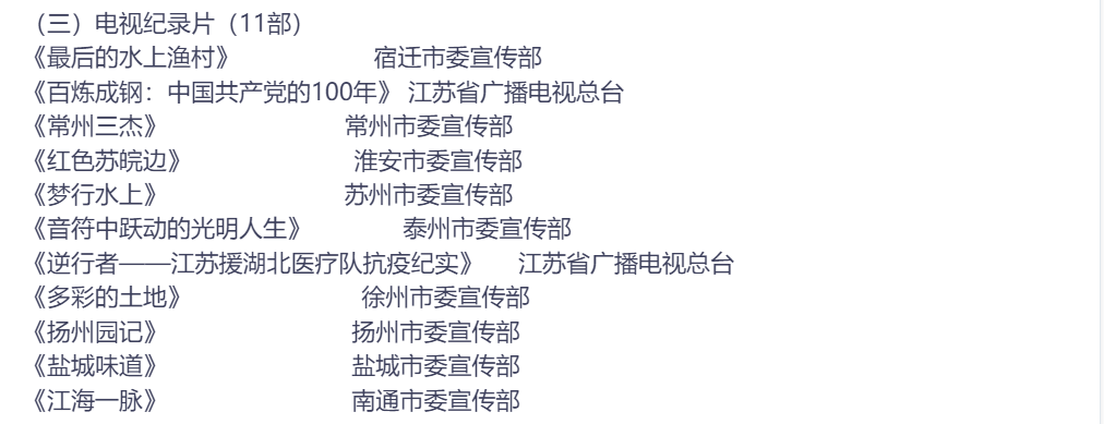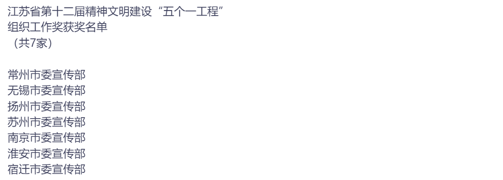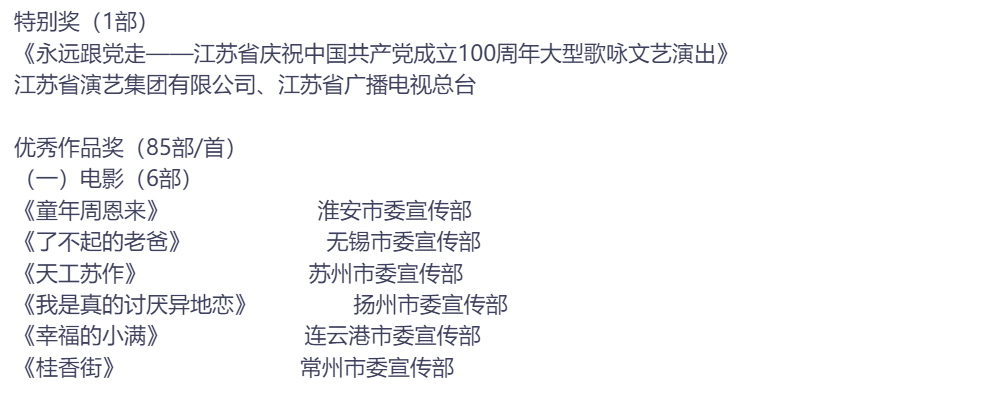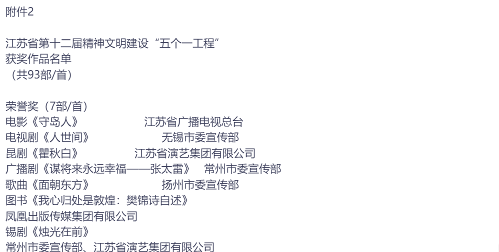为充分展示江苏精神文化产品创作生产的优秀成果,进一步推动江苏文艺“高处再攀高”,省委宣传部组织了江苏省第十二届精神文明建设“五个一工程”评选。经认真评审,授予常州市委宣传部等7家单位“组织工作奖”;授予电影《守岛人》等7部作品“荣誉奖”;授予《永远跟党走——江苏省庆祝中国共产党成立100周年大型歌咏文艺演出》“特别奖”;授予《童年周恩来》等6部电影、《石头开花》等8部电视剧、《最后的水上渔村》等11部电视纪录片、《大王日记》等5部电视动画片、《村里来了花喜鹊》等20部戏剧、《梅兰芳》等10部广播剧、《中国正青春》等10首歌曲、《向北方》等15部图书,共85部作品“优秀作品奖”。