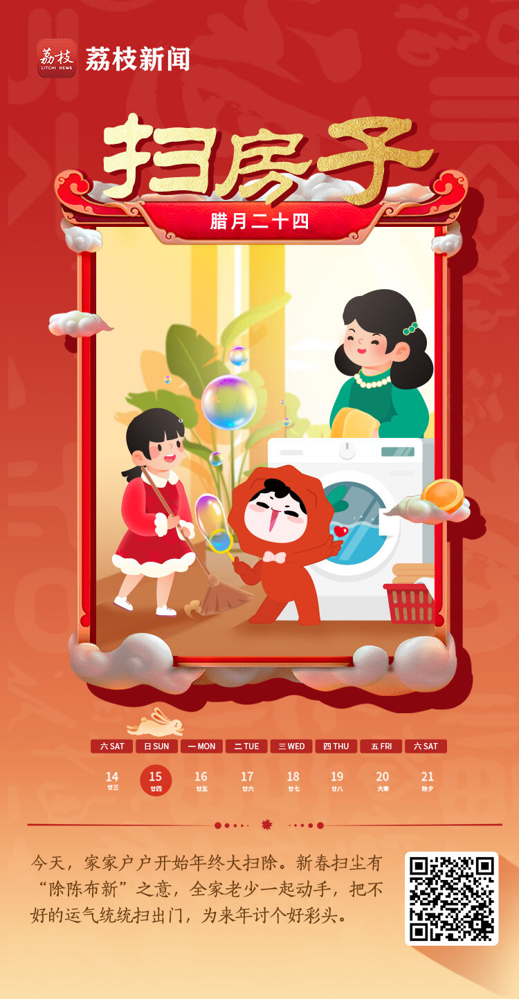 大扫除寄托了人们驱除病疫、“除陈布新”的美好愿望。这一天,全家老少都会起个大早,一起把家里打扫干净,把一切不好的运气统统扫出门。