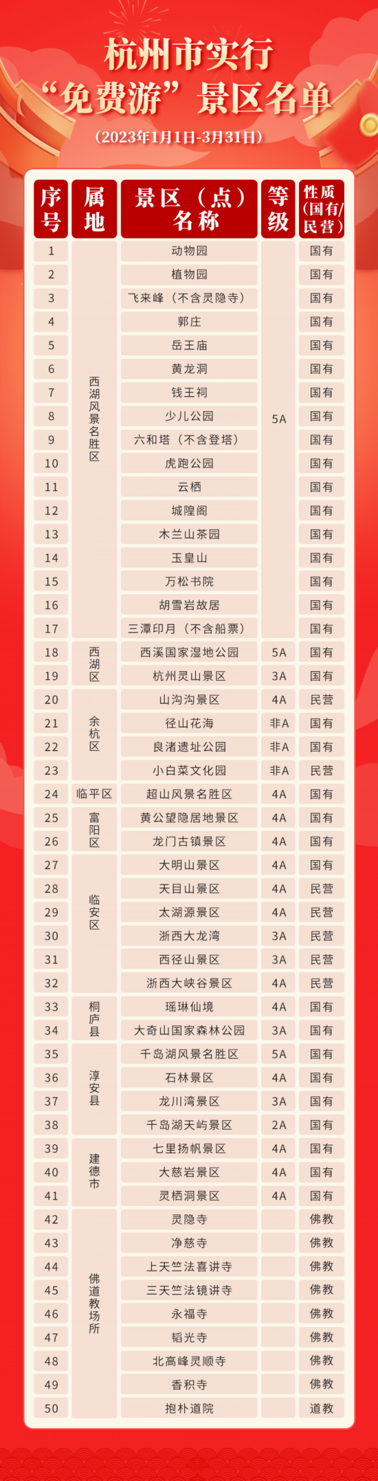 1月1日到3月31日,杭州市对国有A级景区和部分非国有A级景区实行首道门票免费游。包括西湖景区、西溪湿地、良渚遗址公园、千岛湖、大明山、天目山、黄公望隐居地、瑶琳仙境、七里扬帆等41个景区景点。