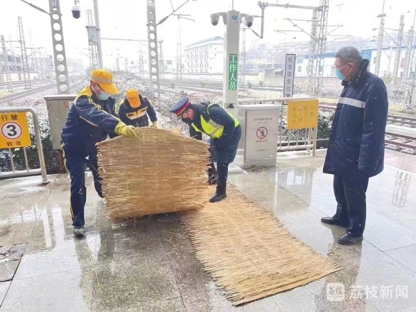 在进站口、天桥、站台端部等湿滑部位铺设了草垫。截至目前,南京两大火车站运输秩序大体平稳。 扬州站出动10余人的应急小队及时清扫积雪,保障旅客出行安全。南京动车段组织党团员突击队在站场铺设防滑草垫、清理站场道岔积雪,对动车组进行除冰作业,并对走行部、高压供电部等动车组关键部件加强检查,确保动车组安全。