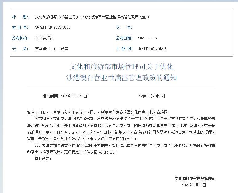 文化和旅游部1月16日消息,为贯彻落实党中央、国务院决策部署,高效统筹疫情防控和经济社会发展,促进演出市场恢复发展,根据国务院联防联控机制综合组《关于对新型冠状病毒感染实施“乙类乙管”的总体方案》和《关于优化内地与港澳人员往来措施的通知》要求,经研究决定,自2023年2月16日起,各地文化和旅游行政部门恢复对涉港澳台营业性演出的受理和审批。暂缓新批涉外营业性演出活动(演职人员已在境内的除外)。