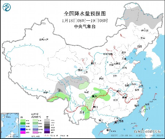 图2 全国降水量预报图(1月18日08时-19日08时)