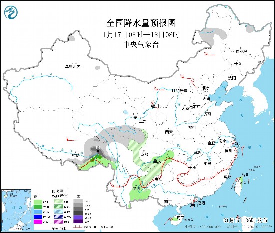图1 全国降水量预报图(1月17日08时-18日08时)