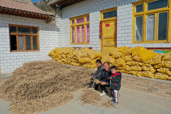 王军军(左一)和父亲(左二)在晾晒中药材。(新华社记者郭刚 摄)