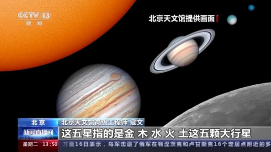 北京天文馆高级工程师 寇文:实际上咱们中国传统真正的五星连珠,指的是金、木、水、火、土这五颗大行星,而且是要在天上聚集在足够小的一个范围内。像这次严格讲还不能叫五星连珠,因为从火星到金星,它们的跨度大概有100度,有点太远了,五星连珠至少也得在三四十度的范围内。