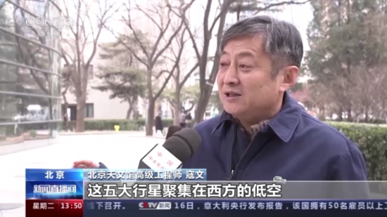 北京天文馆高级工程师 寇文:需要等到2040年的9月份天黑以后,这五大行星聚集在西方的低空,只在10度左右的范围内,那次才是真正的五星连珠,或者叫五星汇聚。不能说是千载难逢,至少也是百年一遇的。