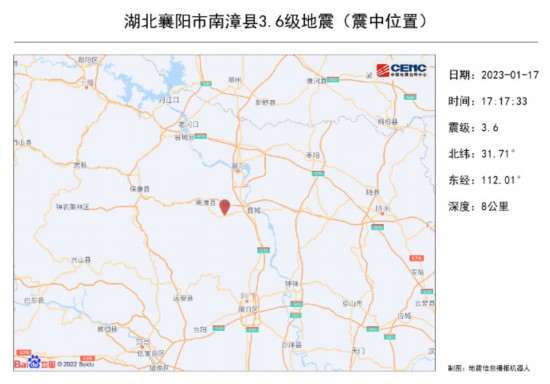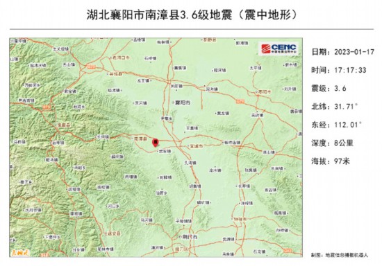 刚才,也就是1月17日17时13分,湖北省襄阳市南漳县发生3.2级地震,震源深度8千米,震中位于北纬31.71度,东经111.99度。