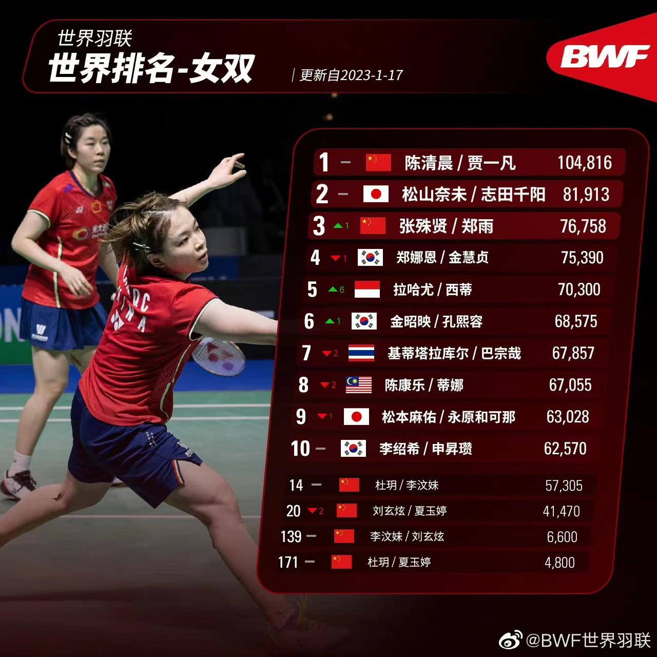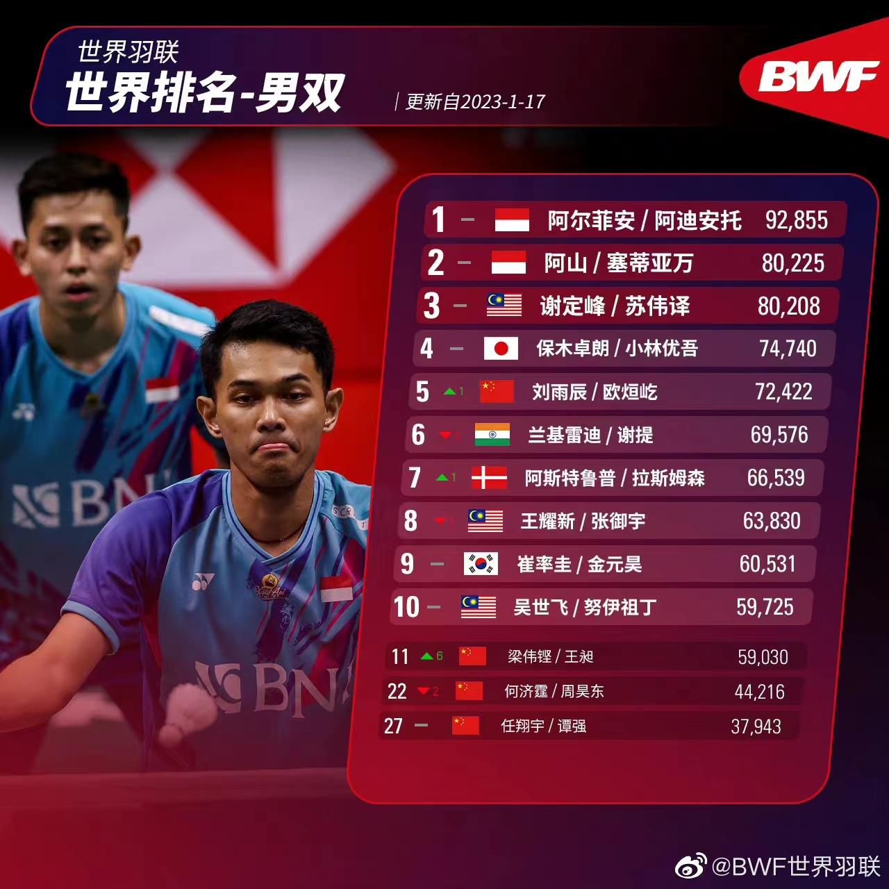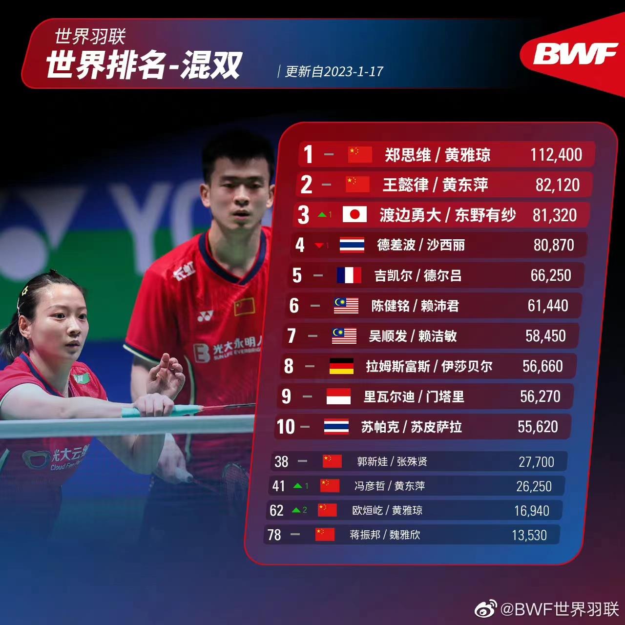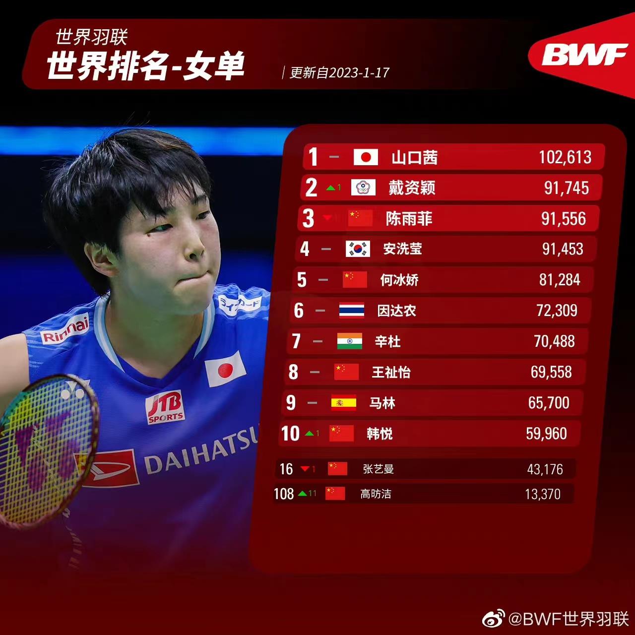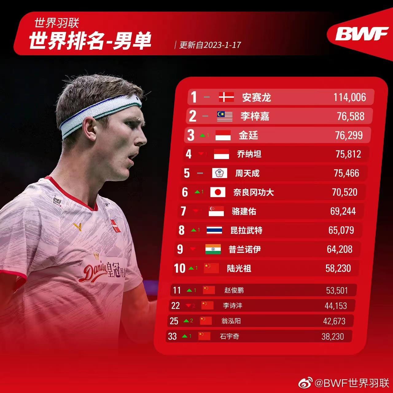 北京时间1月17日,世界羽联官方更新了最新一期世界排名。